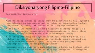Ito ay maiksing salaysay na naglalaman ng isang kwentong may mahalagang pangyayari. Naglalahad ng mahahalagang kaisipan 8. Umaga na at narinig ni Berta ang tilaok ng manok.