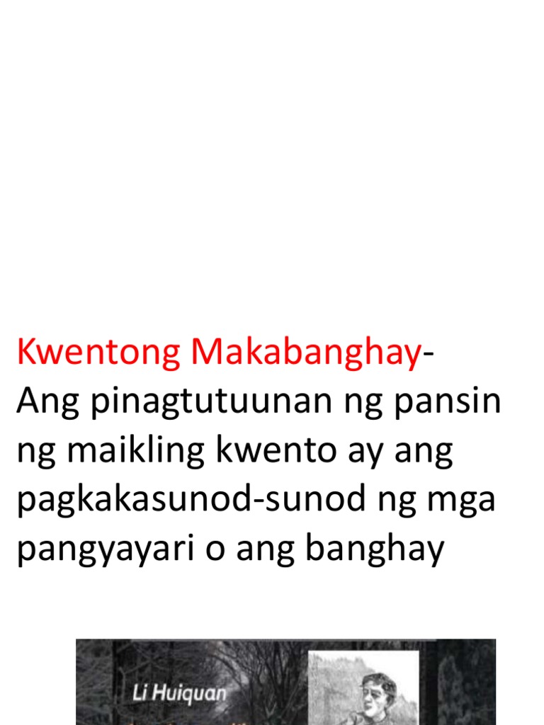 Kwentong Makabanghay-Ang pinagtutuunan ng pansin ng maikling kwento ay ang pagkakasunod-sunod ng mga pangyayari o ang banghay 1. Ang Varayti ng Wika sa mga Premyadong Kuwentong Pambatapdf - Pagsasatinig Pagkabata H UMANITIES Dng ILIMANJULY-DECEMBER 2014 112 90-112. Mga Tagpuan ng Niyebeng Itim na isinulat ni Liu Heng.